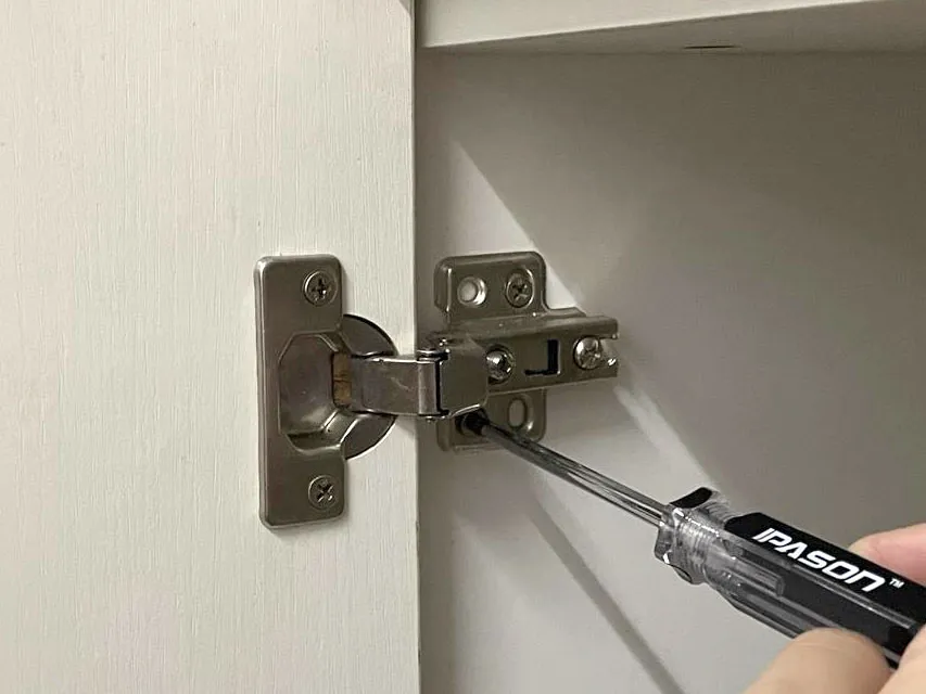 Nachdem Sie sich vergewissert haben, dass alles in Ordnung ist, ziehen Sie alle Schrauben an und befestigen das Scharnier. Wenn es sich um ein weich schließendes Scharnier handelt, können Sie prüfen, ob die Funktion des langsamen Schließens dieses Scharniers jetzt normal ist.